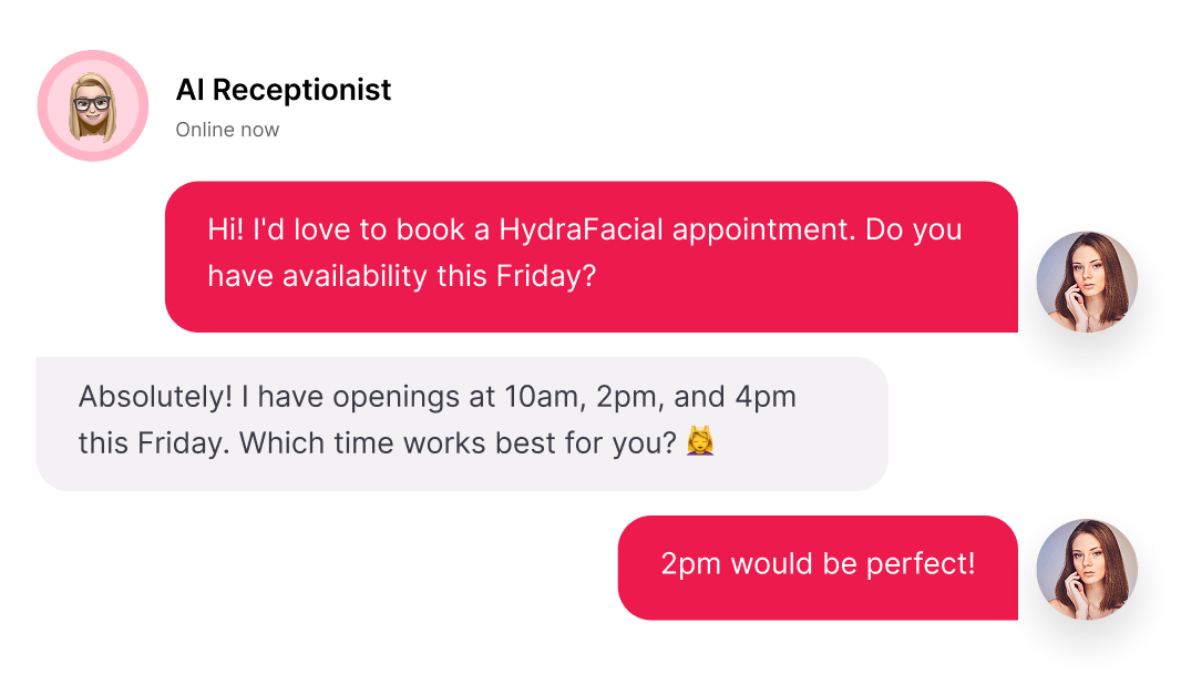Your AI agent engages potential clients with warmth and professionalism — answering questions, guiding them through services like Botox, fillers, laser treatments, skincare packages, and wellness consultations, then booking appointments automatically.